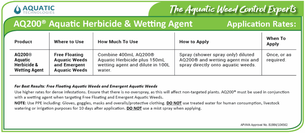 How Much to Use: For emergent and surface aquatic weeds, create a mixture by combining 400mL of AQ200® Aquatic Herbicide with 150mL of wetting agent, diluted in 100L of town or tank water.