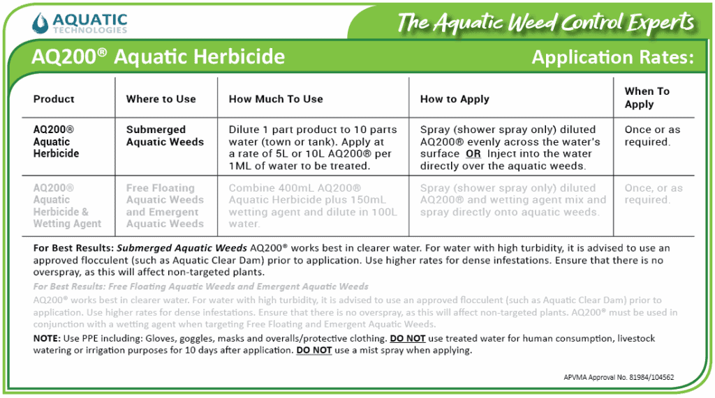 - For Free Floating and Emergent Aquatic Weeds, ensure AQ200® is used with a wetting agent.
